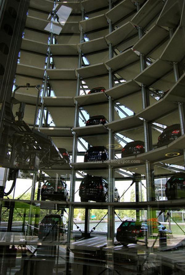tall glass silos used as storage for new Volkswagens. The two towers are